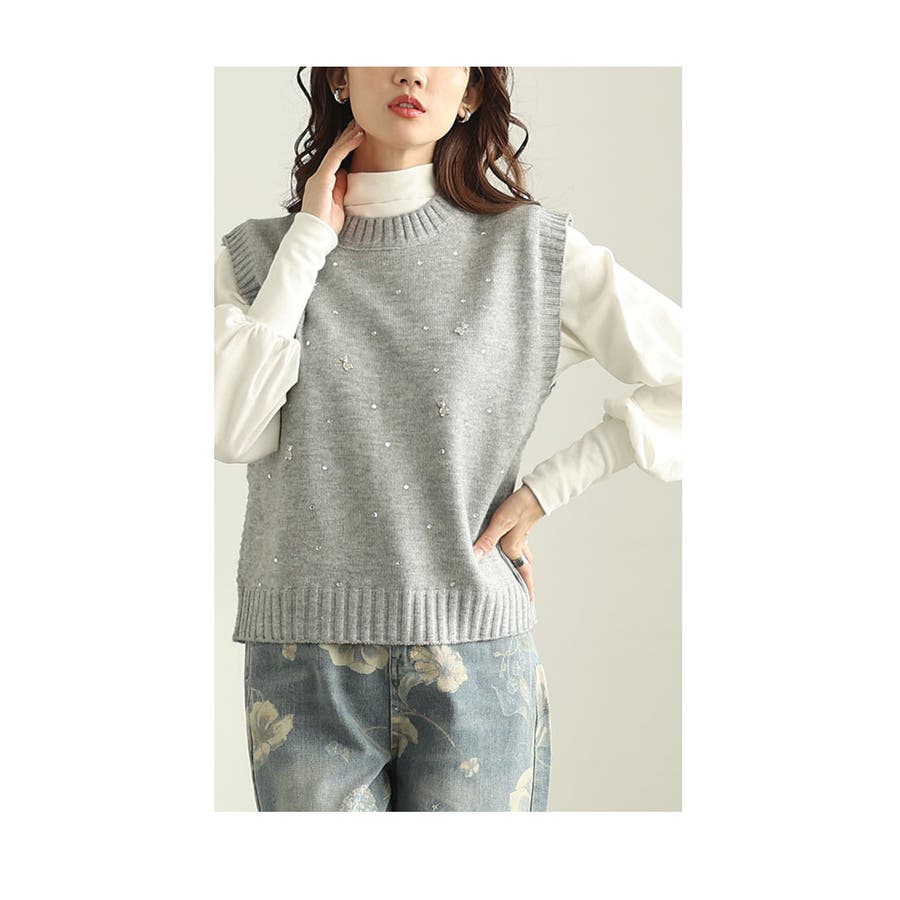 可愛く煌めくクマちゃんビジューのニットベストトップス。