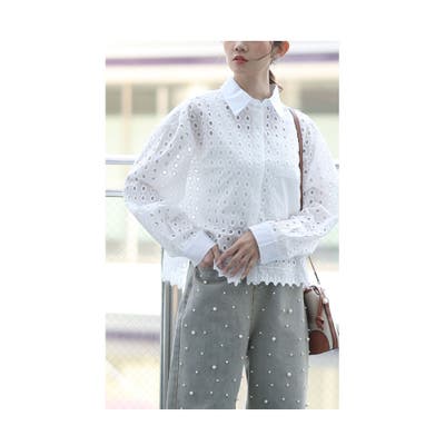 お花が浮かび上がるパンチングレースのコットンシャツブラウス。