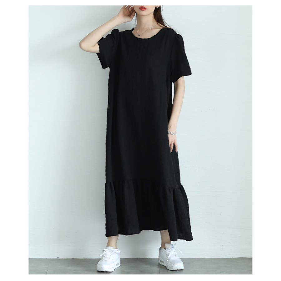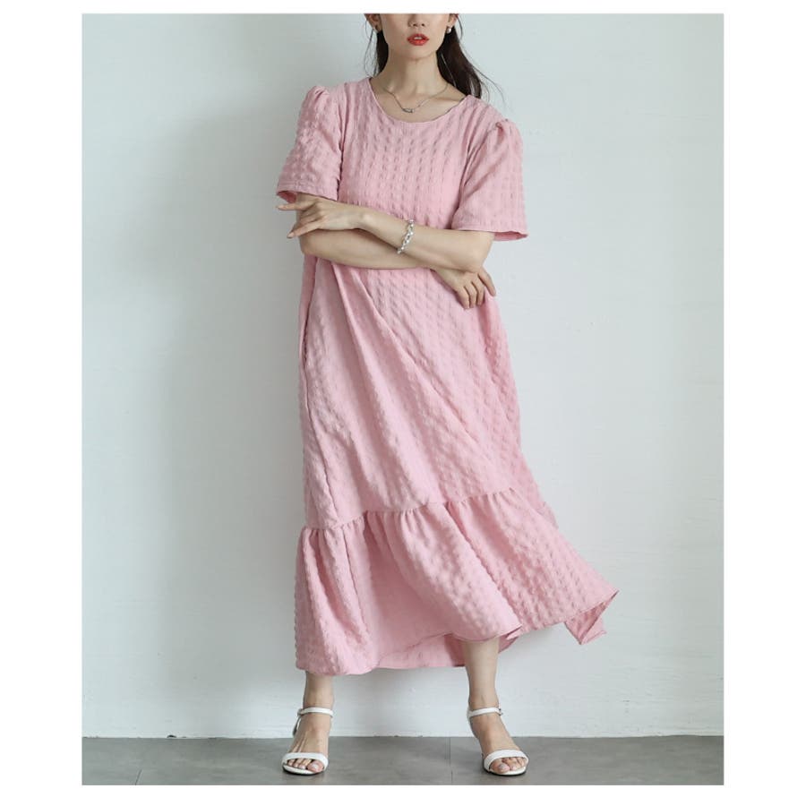 ぽこぽこ素材のふんわりペプラムフレアワンピース レディース ファッション