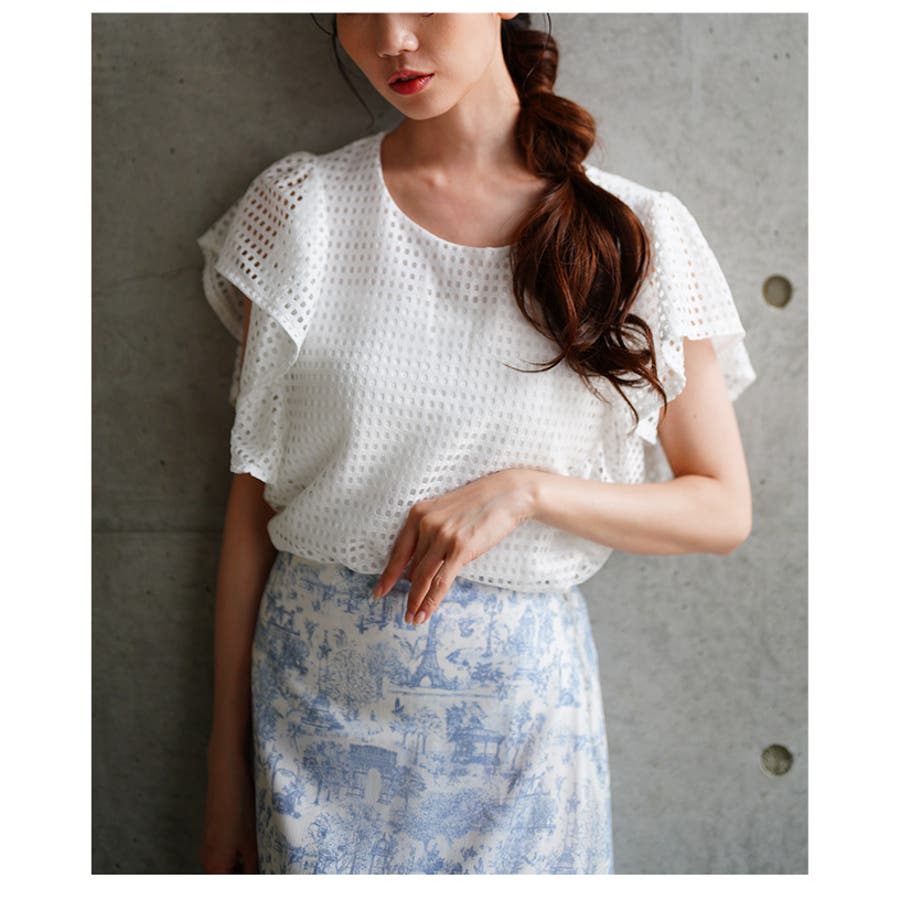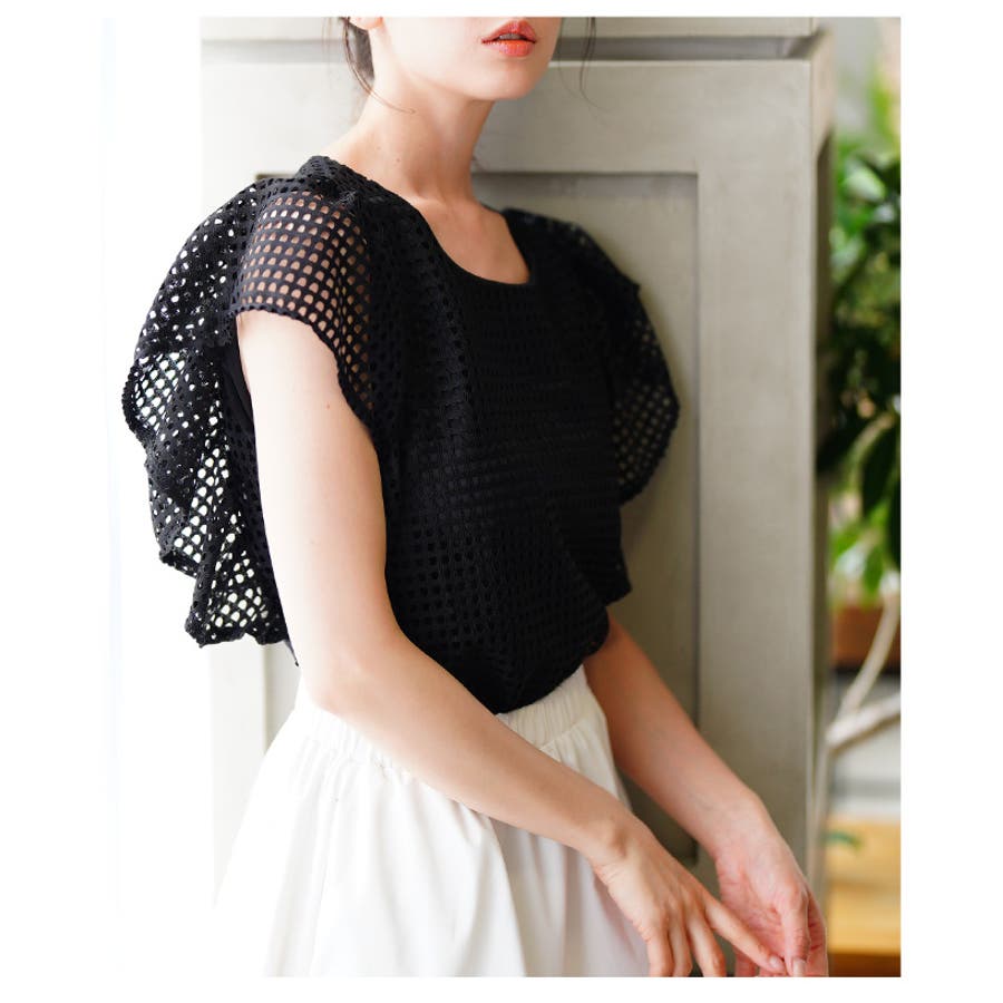 控えめな甘さがちょうどいいメッシュフリルスリーブトップス。