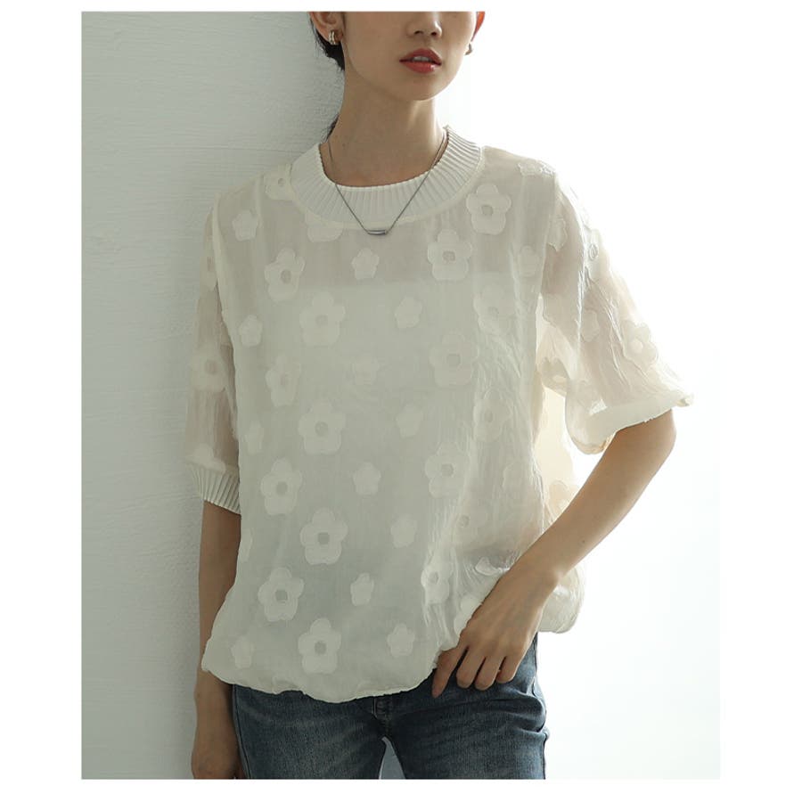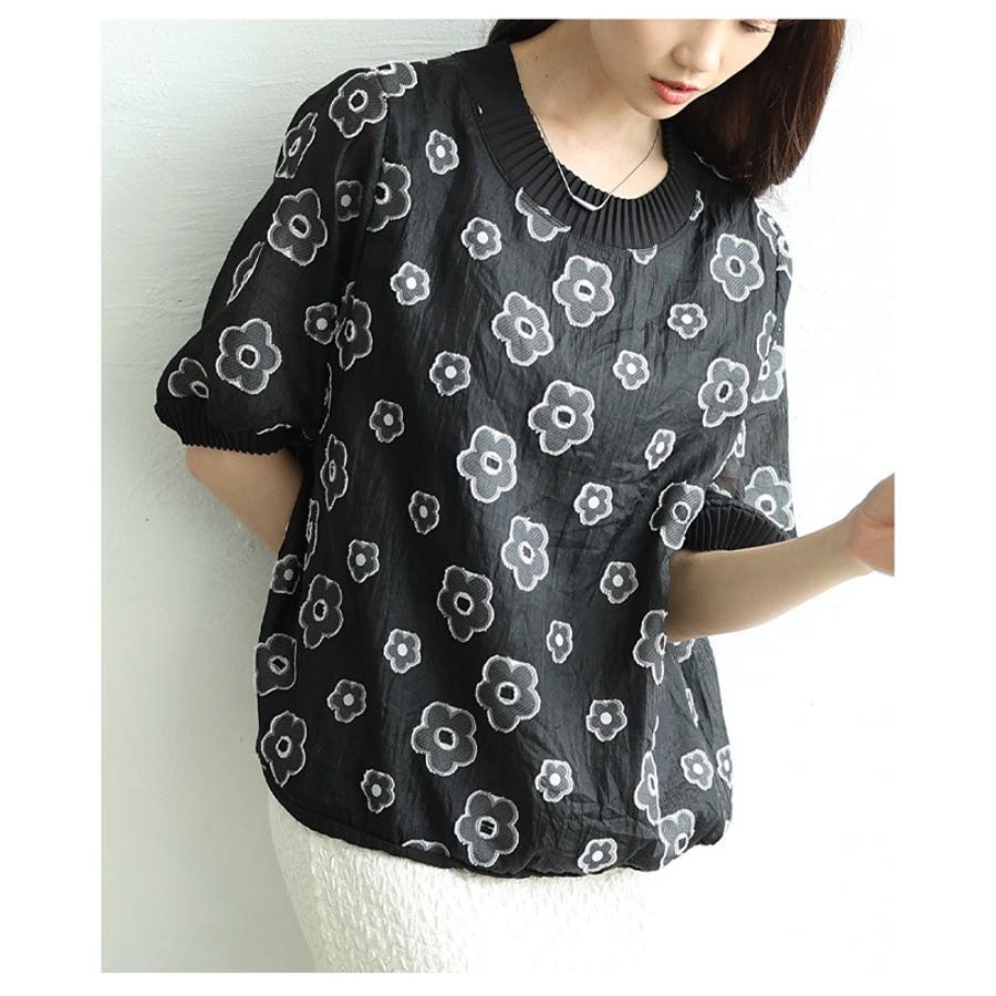 デイジーフラワー柄ワッシャー風半袖プルオーバー レディース ファッション