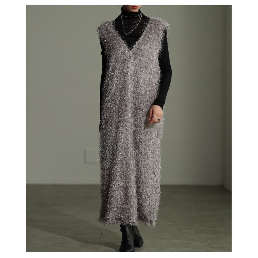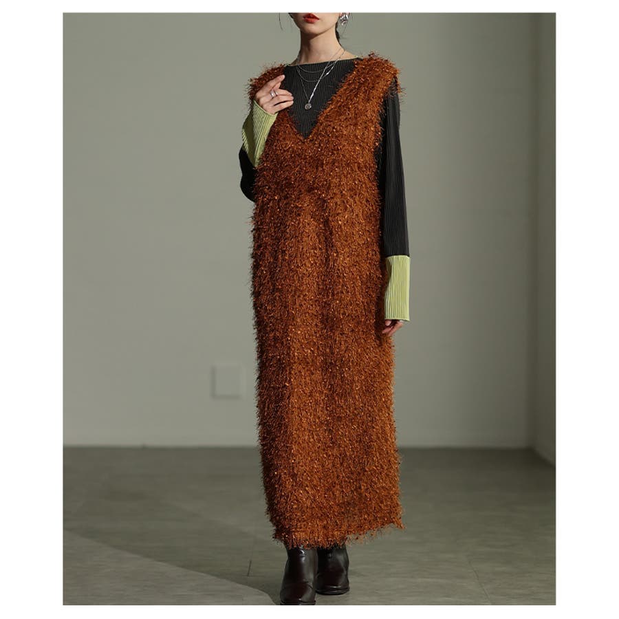 主役級の華やかさ纏うフェザーニットVネックジャンパースカート レディース