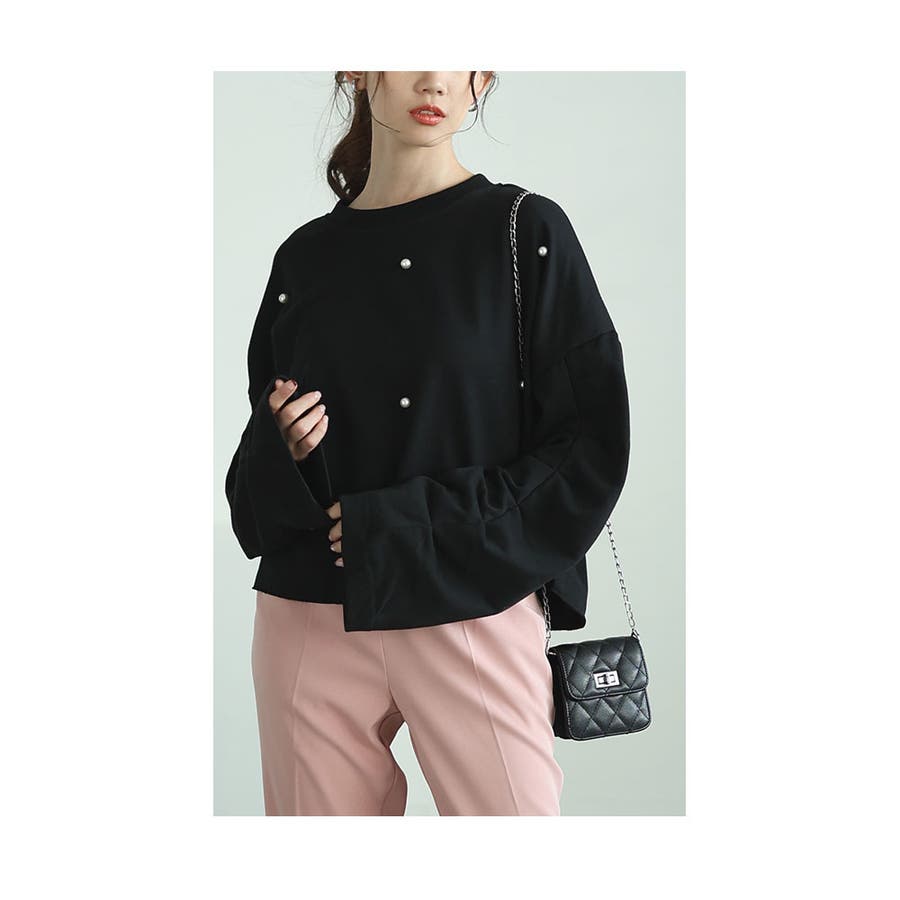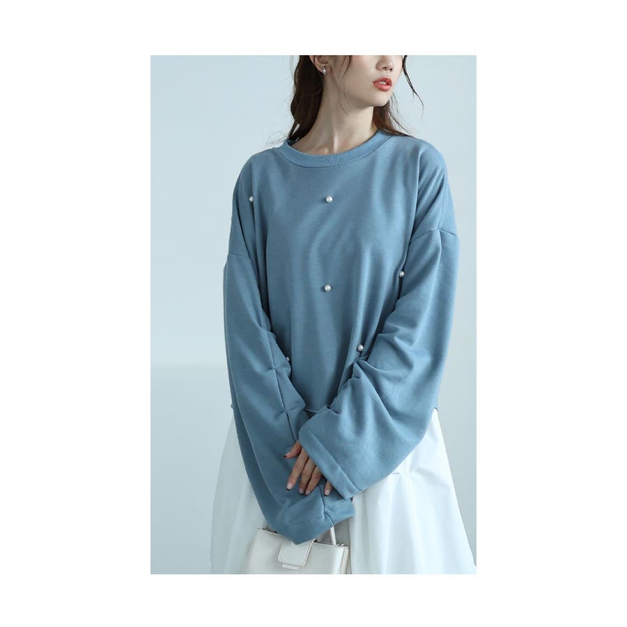 着丈はおへそと脚の付け根の中間くらい、袖丈は指先ものぞかないくらいの長さでした。コットン混のミニ裏毛スウェット生地で、身頃・袖ともにゆったりしたサイズ感でした。袖内側はタックを取って袖全体がカーブしたデザインになっています。前身頃はパールを散りばめ、裾は切りっぱなしです。程よい厚みなので長いシーズン重ね着などで色々なコーデを楽しめそうです。
