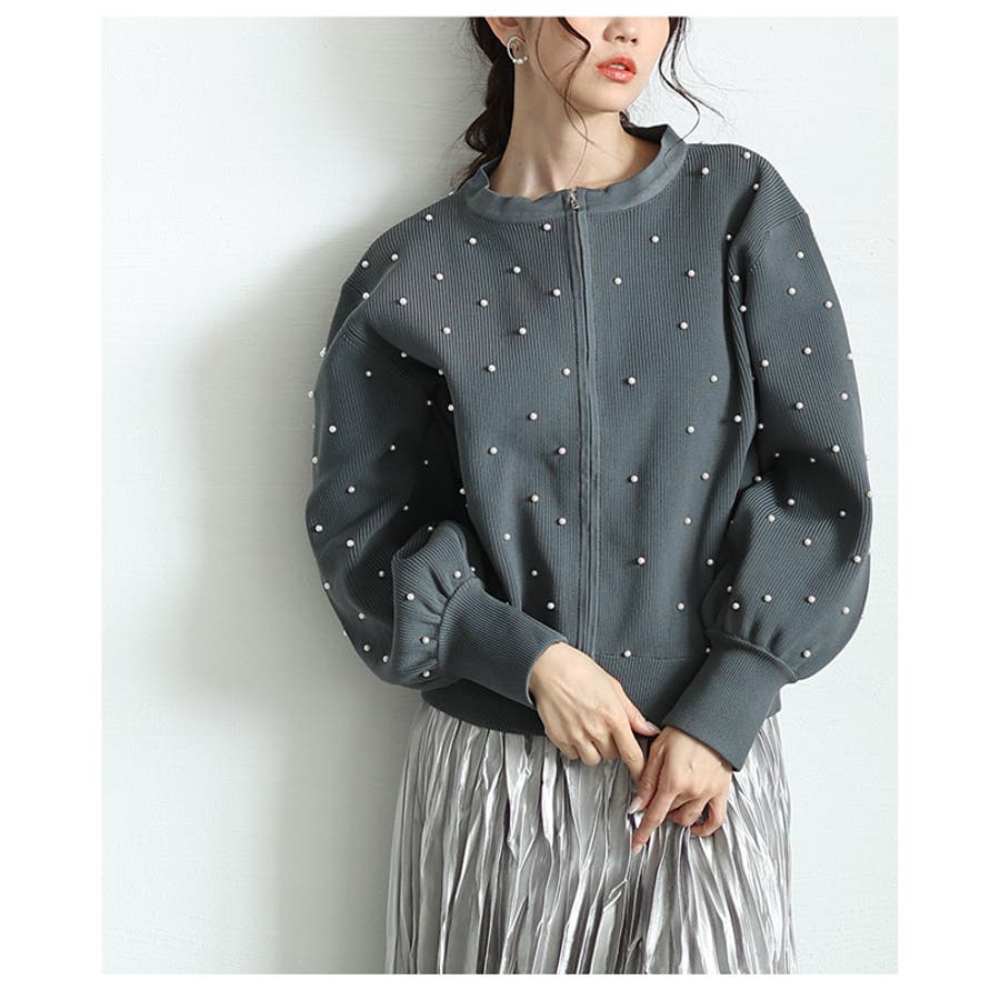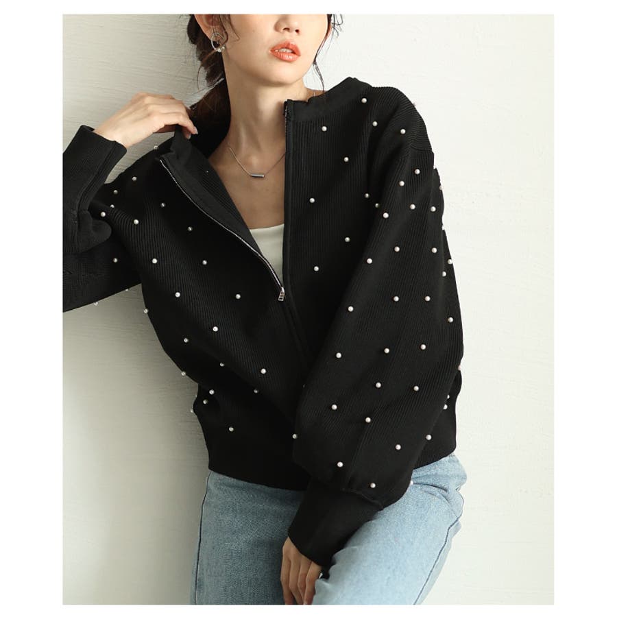 艶やかなパールを散りばめたもっちりニットパーカー レディース ファッション