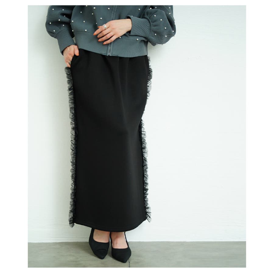 チュールフリルが可愛いボンディングセミタイトスカート。