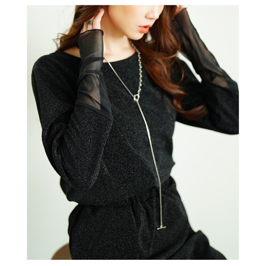 1枚でもレイヤードでも着まわせるフリルシアー袖ラメカットソー。