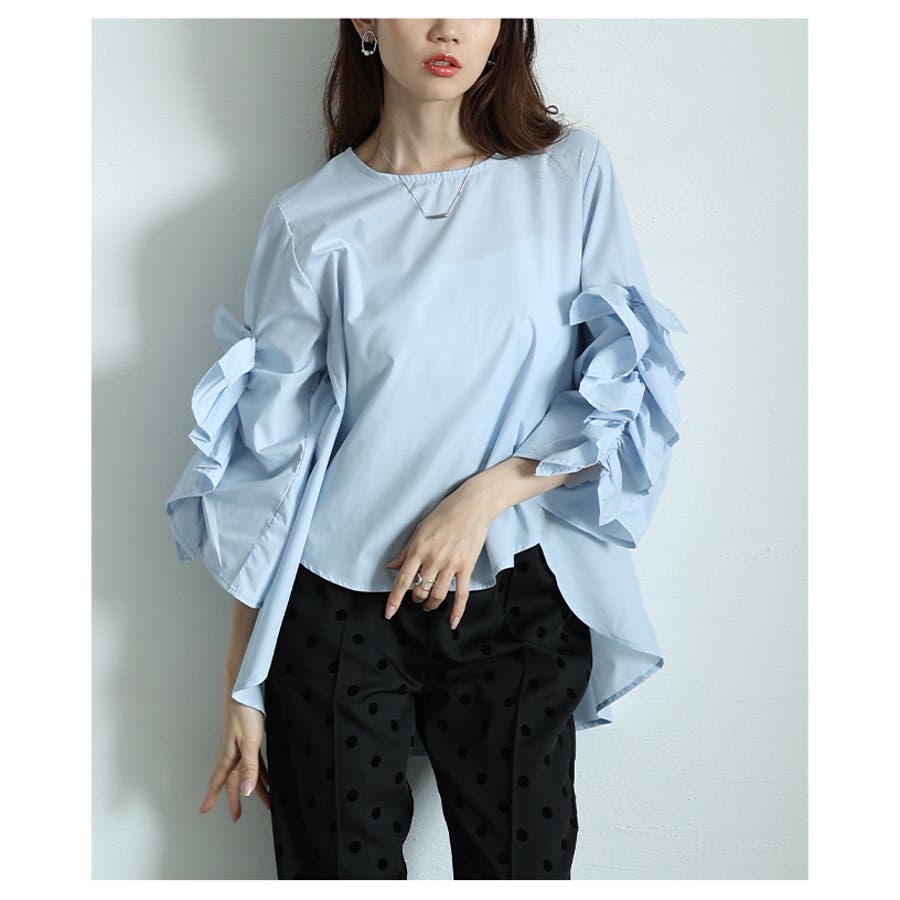 袖に大胆にあしらわれたフリルが華やかな一着。