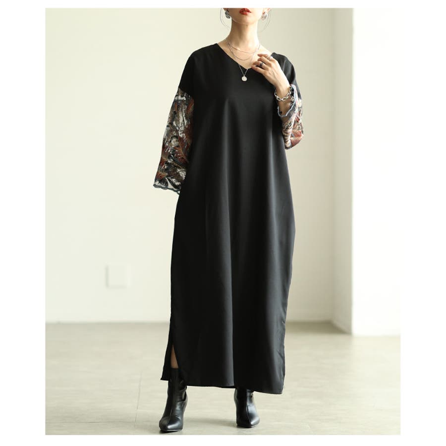 【ブラック】ドラマティックに彩るスリーブ刺繍Vネックワンピース レディース ファッション