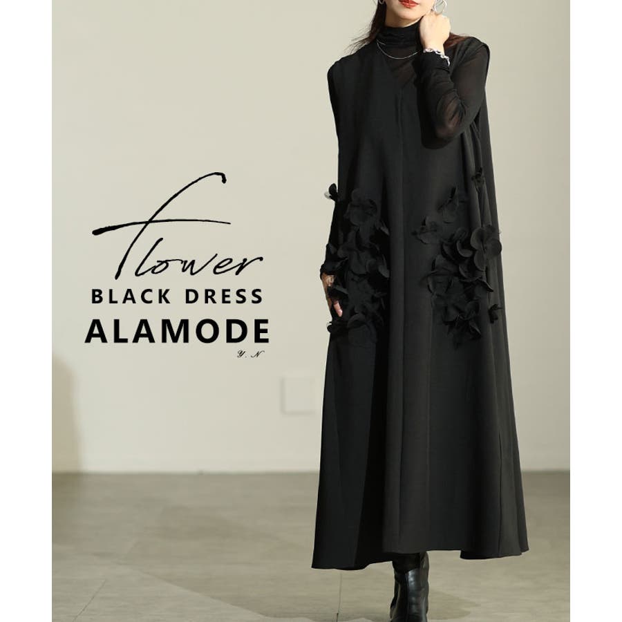 フロントにあしらわれた花びらが印象的なブラックワンピースです。ありそうでなかったデザインに一目惚れ、ジャンパースカートタイプなのでインナーを変えればキチンとしたお出かけシーンからカジュアルな場面まで幅広く活躍すること間違いなし!