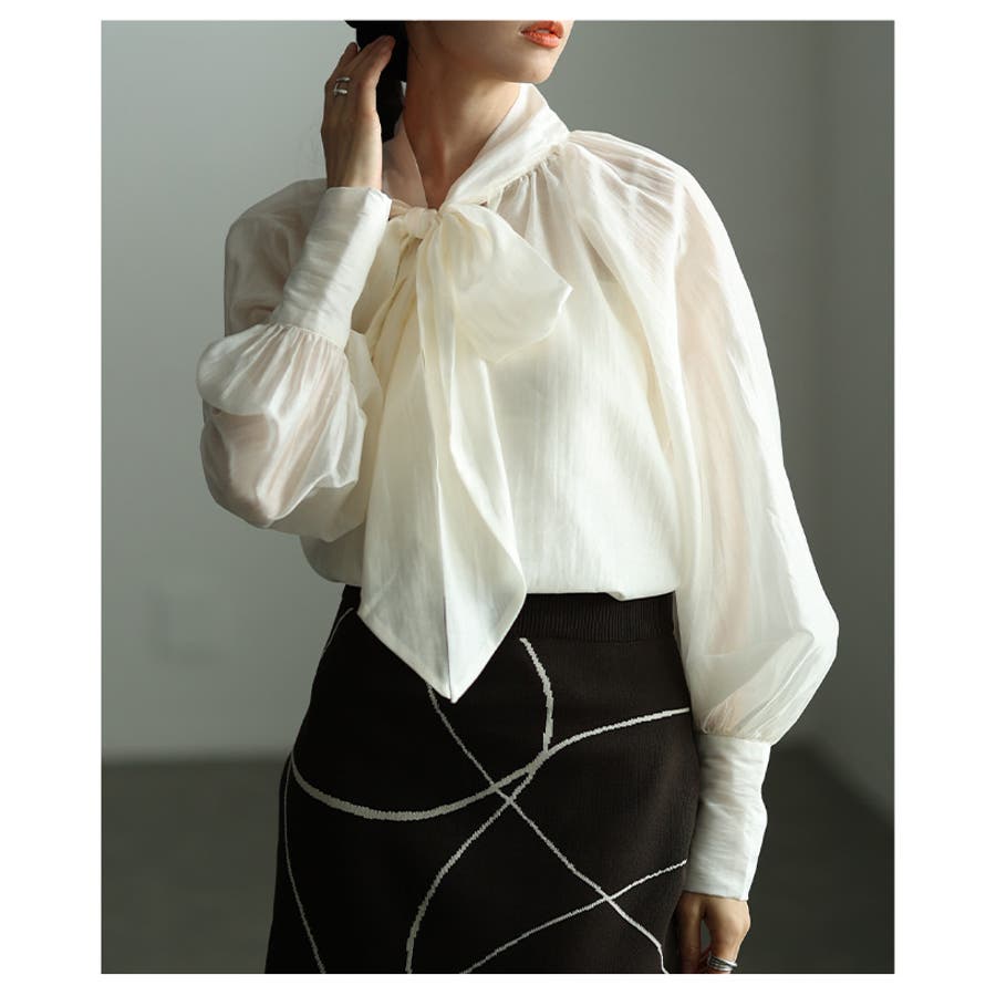 特徴: リボンタイ ボウタイ ボリューム袖 ロングカフス ギャザー シアー プルオーバー