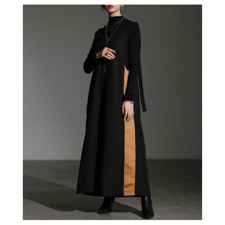 サイドのラインで「縦ライン」を強調しスタイルアップ!中にいれるインナー次第でロングシーズン楽しめます☆スタイリッシュなサロペットスカートは一枚持っていると大活躍すること間違いなし!