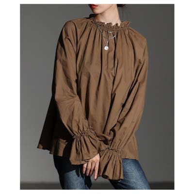 特徴: フリルネック ベルスリーブ フレア ギャザー バックボタン