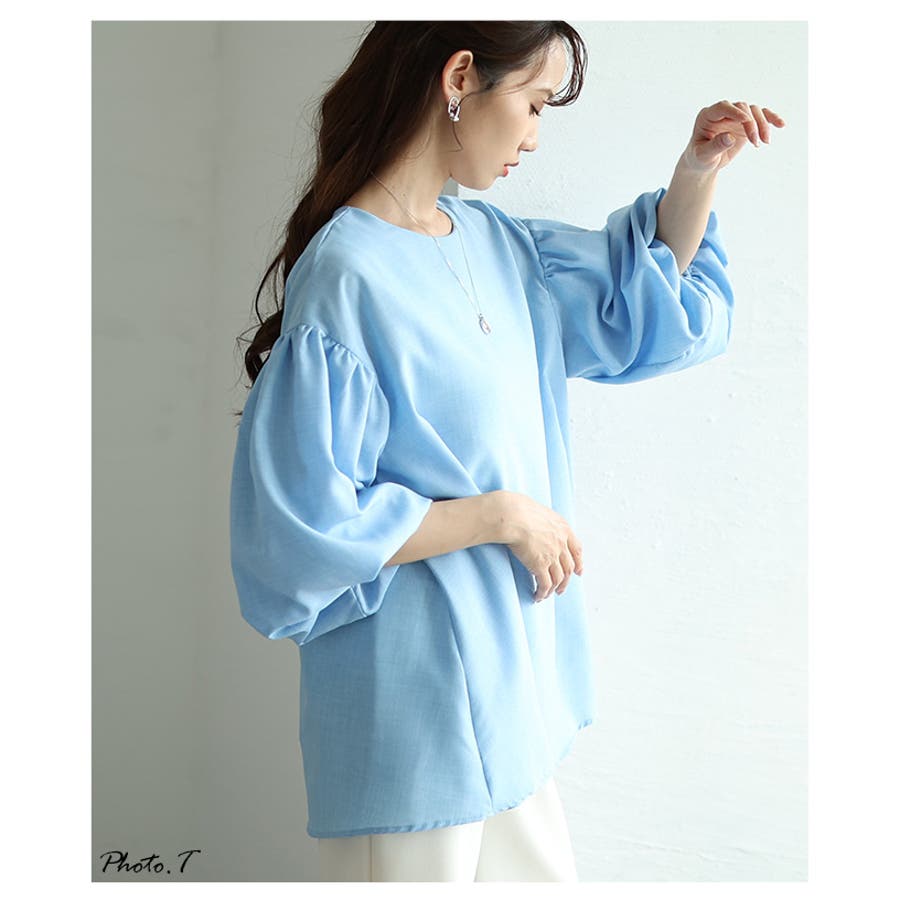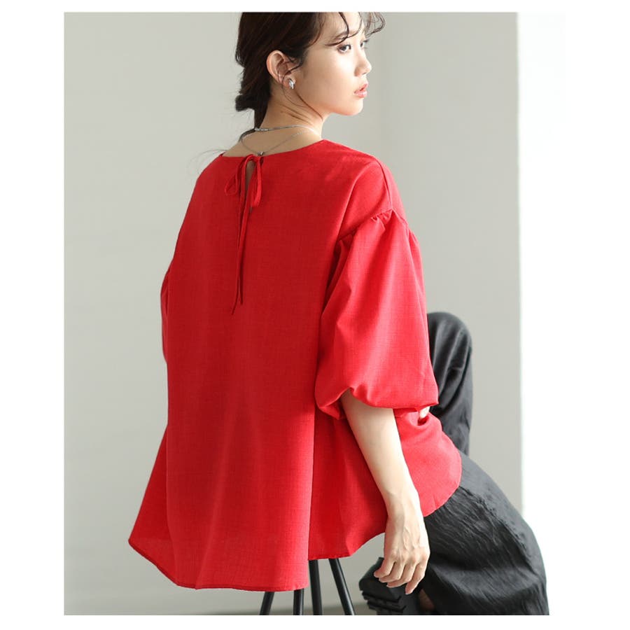 首元はすっきりとしたラウンドネックに、後ろ側にはリボンで結ぶタイプだから着脱もしやすく、後ろ姿を愛らしい印象に。ボリューミーなスリーブだから気になる二の腕もカバーし、袖口にはゴムを採用し、ボリューム感をアップ。さらっと爽やかなテクスチャーで涼し気な印象に。一枚で着映え力の高いチュニックはカラバリが豊富だから、シーンやスタイリングに合わせてお色をシフトしても楽しめます。