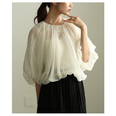 ふんわりシルエットが可愛らしいバルーンブラウスです。オーガンジー生地が二枚仕立てになっていてボリューム感抜群。ややショート丈なので脚長効果抜群!ボトムスはコンパクトなシルエットを選ぶとバランスがとりやすいですよ♪