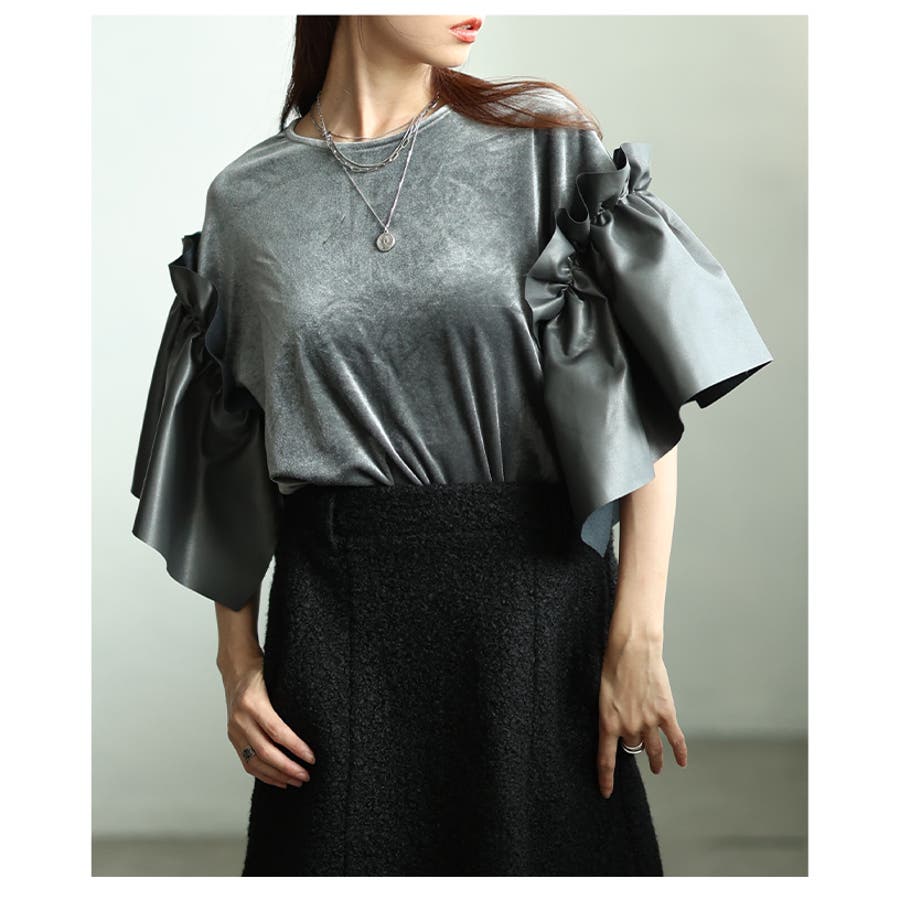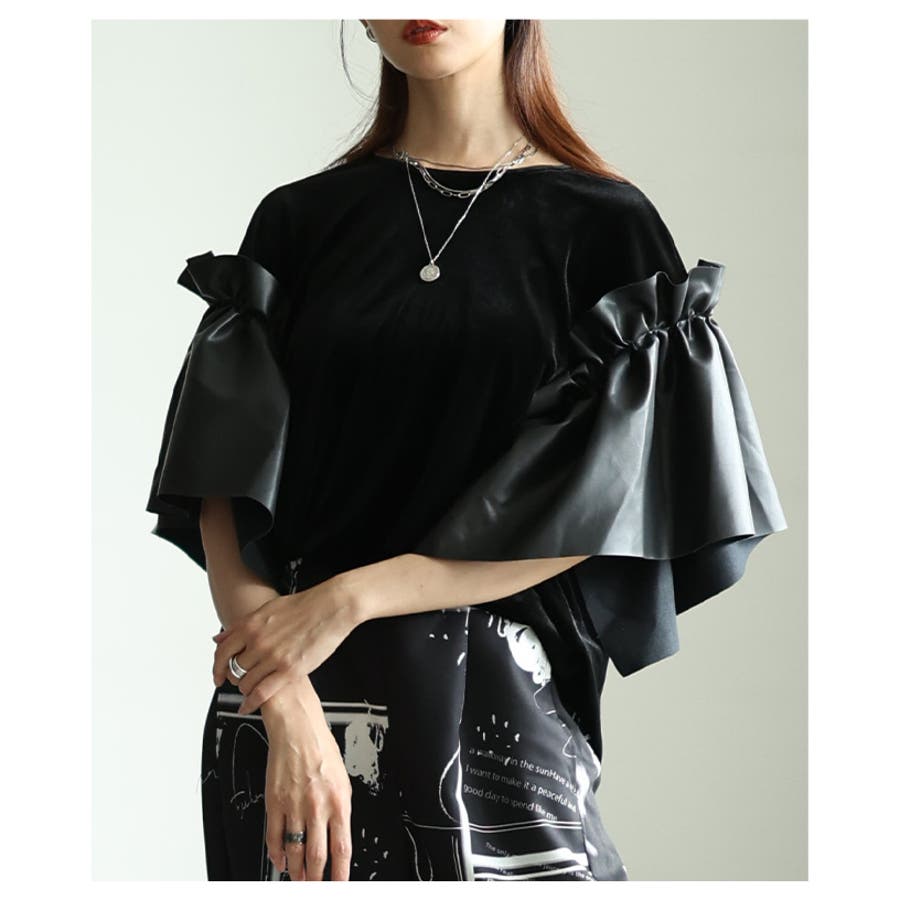 モードに揺れるベロア×フェイクレザーフレアスリーブトップス レディース ファッシ…