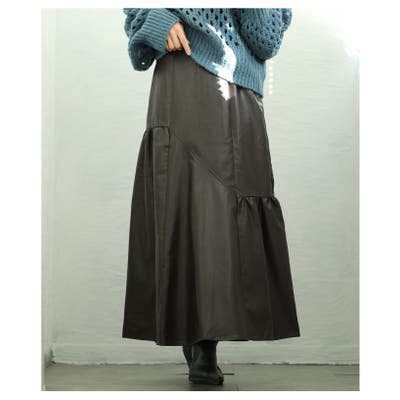 特徴: アシンメトリー ギャザー フレア フェイクレザー サイドファスナー バックウエストゴム 裏地