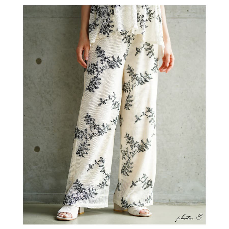 シックに華やぐリーフ刺繍がナチュラルなメッシュワイドパンツ レディース ファッシ…