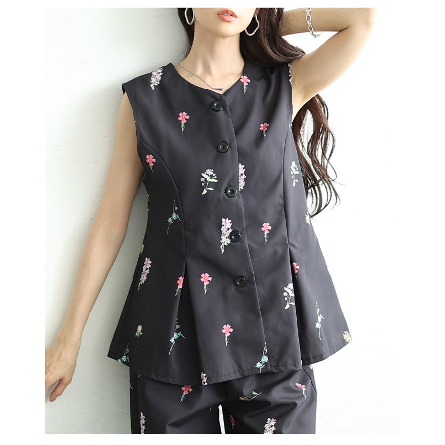 爽やかな甘さ引き立つ花柄ペプラムフレアノースリーブトップス レディース ファッシ…