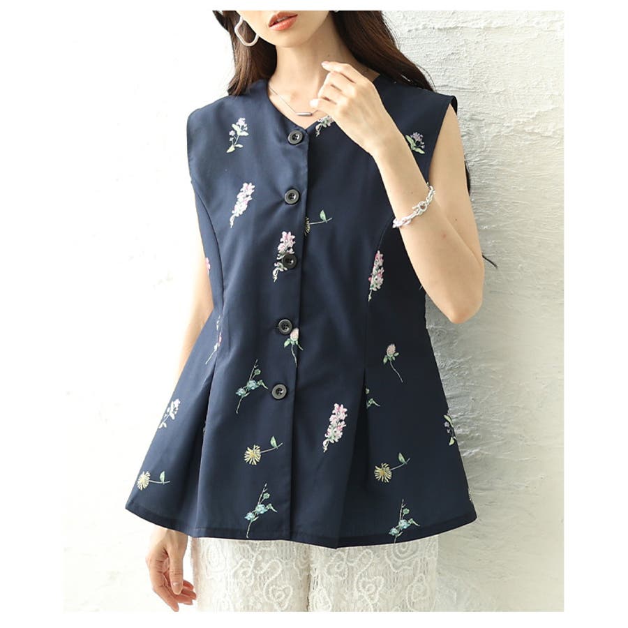 洗練されたシンプルなノースリーブデザインに、可憐な小花柄刺繍が散りばめられた、大人の女性にぴったりな一着。フロントのボタンデザインが、クラシカルで品のある表情を添え、甘さを抑えた上品な華やかさをプラス。ボタン付きだから羽織りとしても活躍し、スタイリングの幅を広げます。ボディラインを綺麗に魅せる立体切り替えに、裾に向かってふんわりと広がるペプラムデザインが、女性らしいメリハリのあるシルエットを実現。気になる腰まわりも自然にカバー。