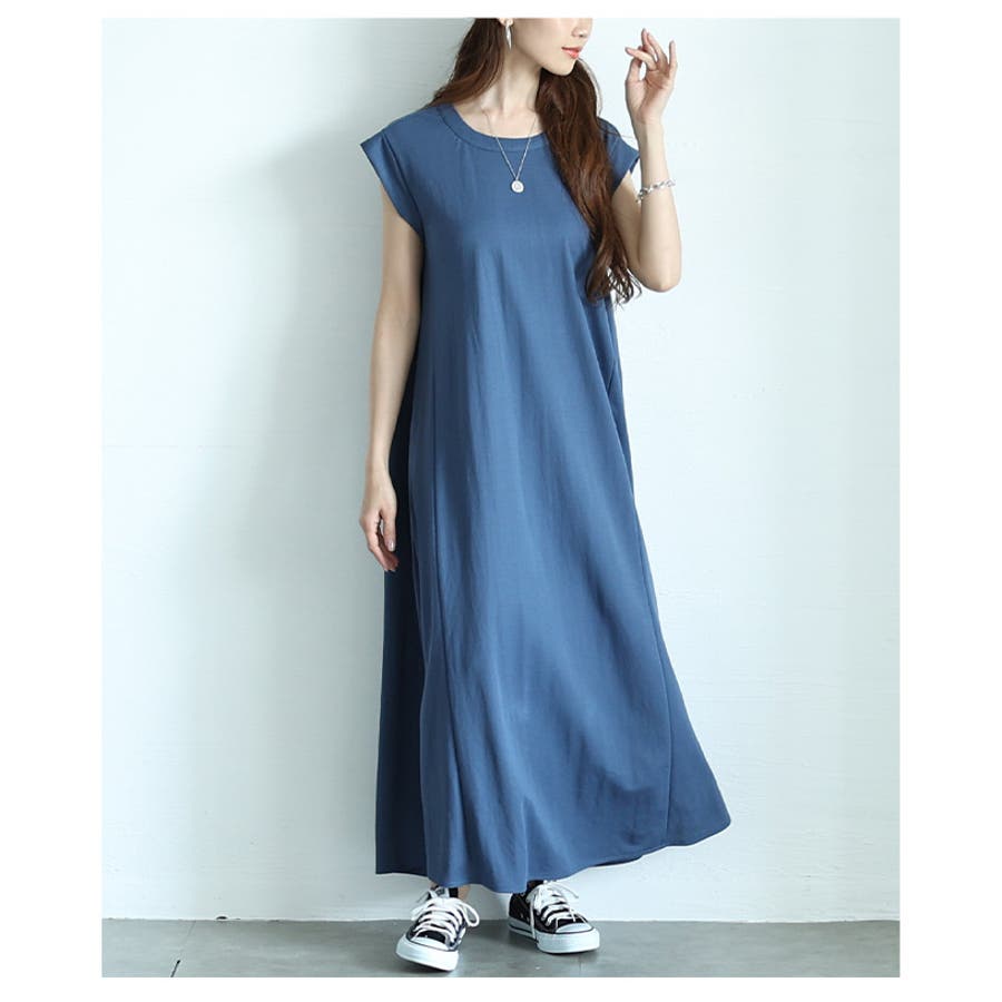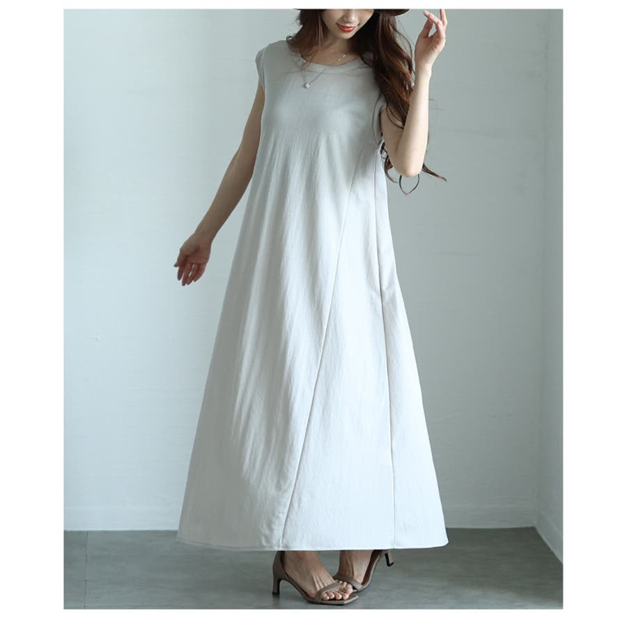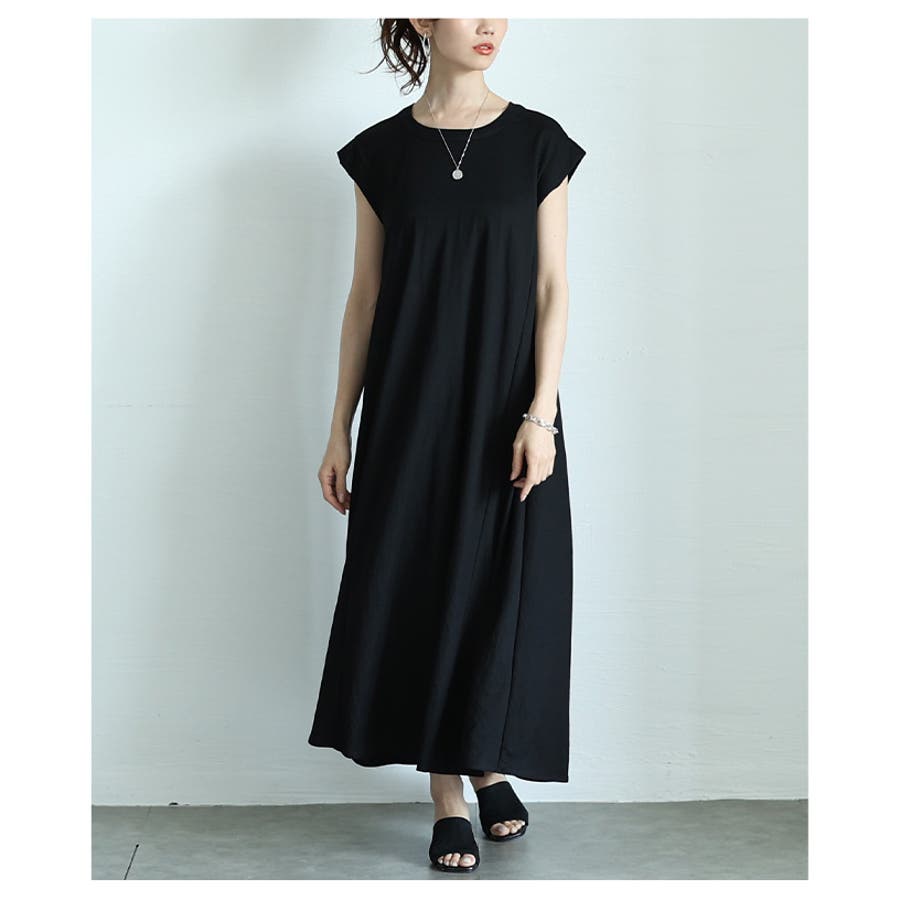 ストンと落ちるシルエットでありながら、サイドに施された切り替えから生まれる自然なフレアが、女性らしいエレガントさを演出。歩くたびに揺れるスカートラインが、軽やかな印象を与えます。二の腕をすっきりと見せてくれるフレンチスリーブは、ノースリーブが苦手な方にもおすすめ。肩回りを華奢に見せる効果も期待できます。