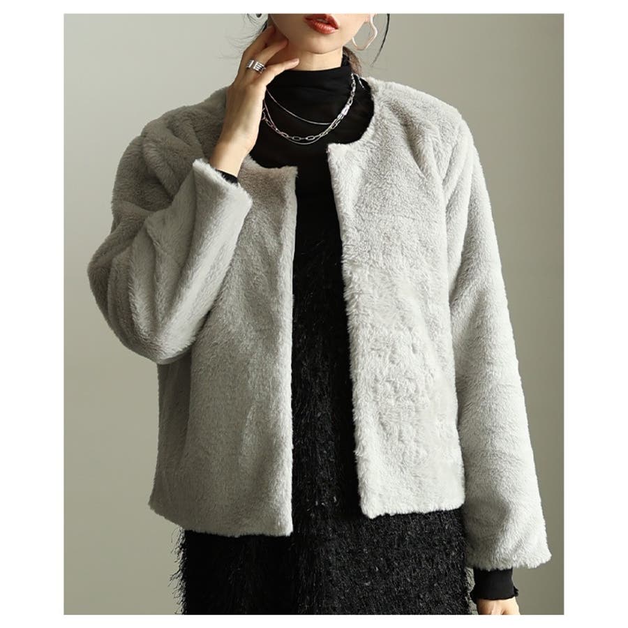 纏う愛されノーカラーフェイクファーライトジャケット レディース ファッション