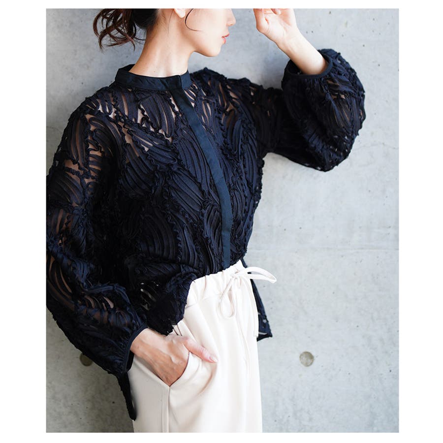 甘さを引いた大人のレースシアーふんわり袖シャツブラウス。