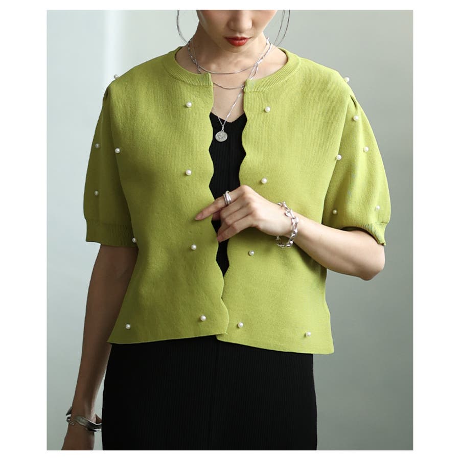 スポンジニットにパールが施されたカーディガンは秋口にぴったりの一着。ベーシックなブラックは勿論、グリーンもオリーブも差し色として意外と使いやすいんです◎ワンピースに羽織ったり、デニムとカジュアルに合わせるのもおすすめのコーデです♪