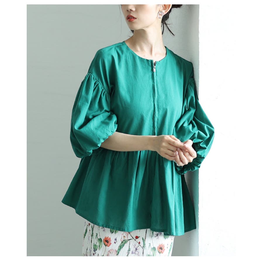 甘さと品を両立するボリューム袖ペプラムジップアップチュニック レディース ファッ…