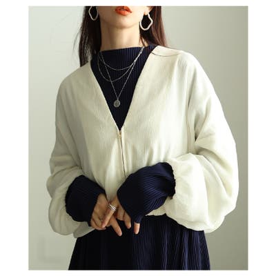特徴: ボリューム袖 Vネック ジップアップ 裾ゴム シアー 裏地 バルーン ノーカラー