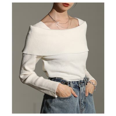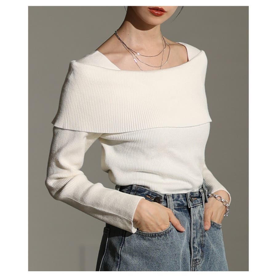 トレンドのオフショルダーを大人仕様にアップデートしたニットトップスです。オフショル風のデザインなのに実際にはスクエアカットの襟ぐりが露出を程よく抑えながらも、オフショル独特のこなれ感を演出してくれます。