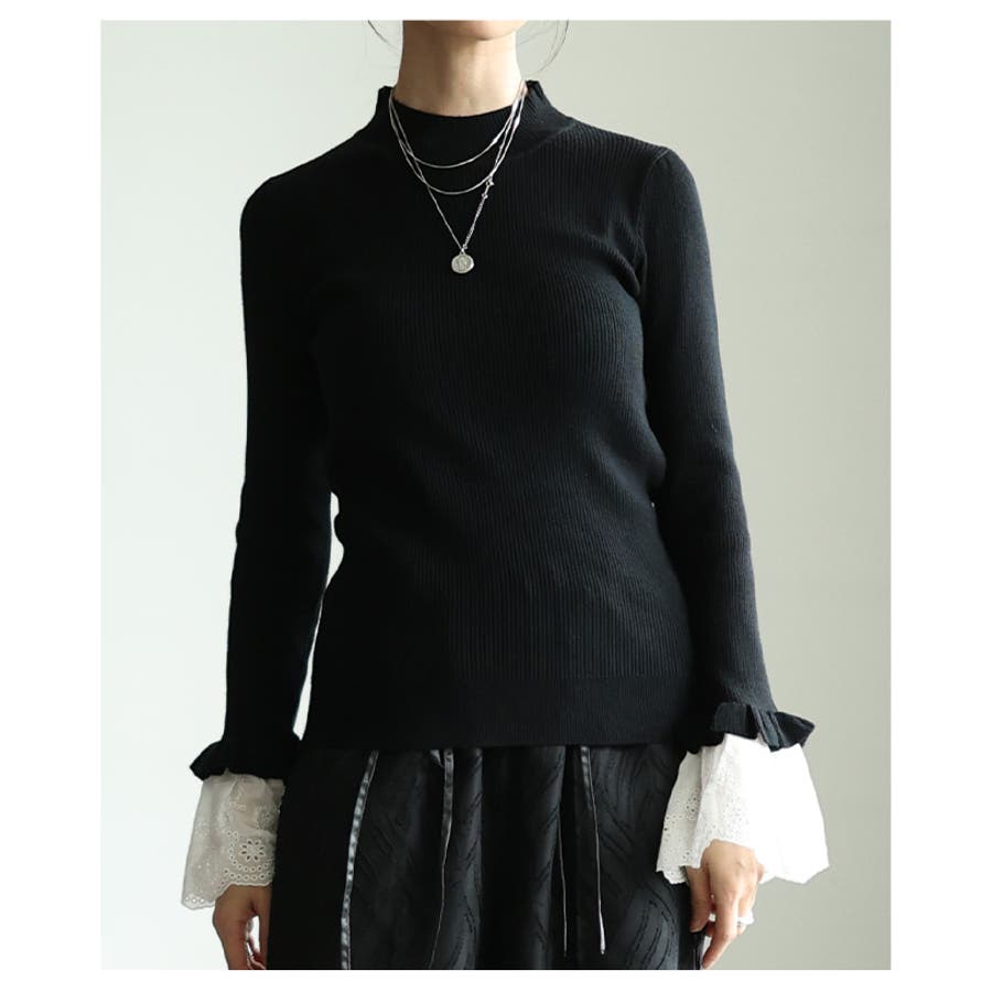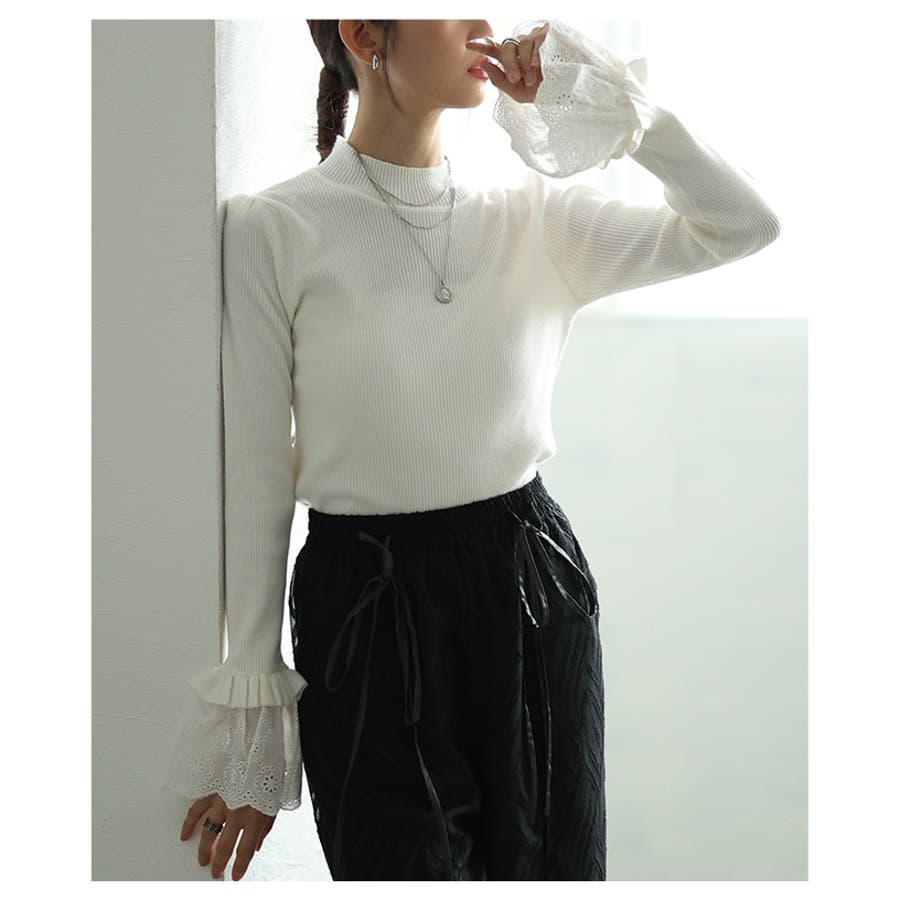 特徴: レース リブ モックネック フレア フリル