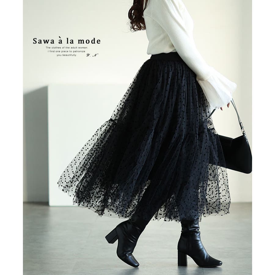 レディライクなチュールドットフロッキーギャザーフレアスカート レディース ファッ…
