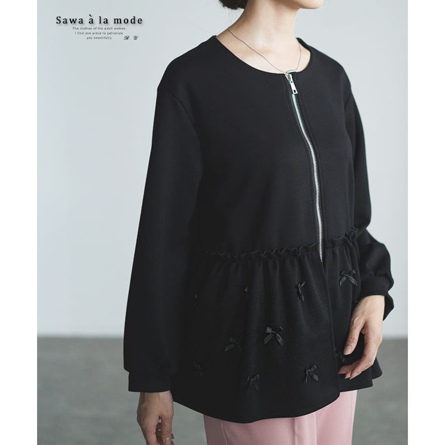 着丈はヒップがほぼ隠れるくらい、袖丈はちょうどでした。柔らかで滑らかな肌触りのカットソー生地で、ややハイウエスト位置からのペプラム切り替えでお腹からヒップ周りが気になりません。ペプラム部分は前後に小さなサテンリボンが散りばめられており、袖もぽわんとしていて可愛いです。首元は少し鎖骨がのぞくくらいのラウンドネックでフロントファスナー開きです。ペプラム部分は生地が二重になっています。