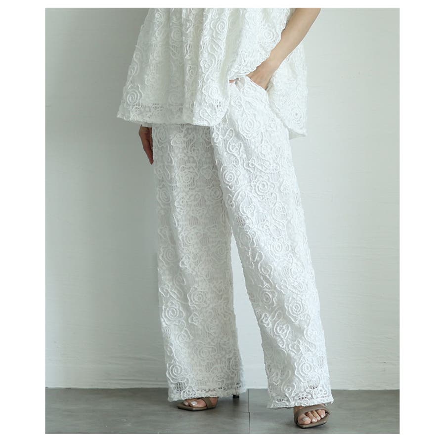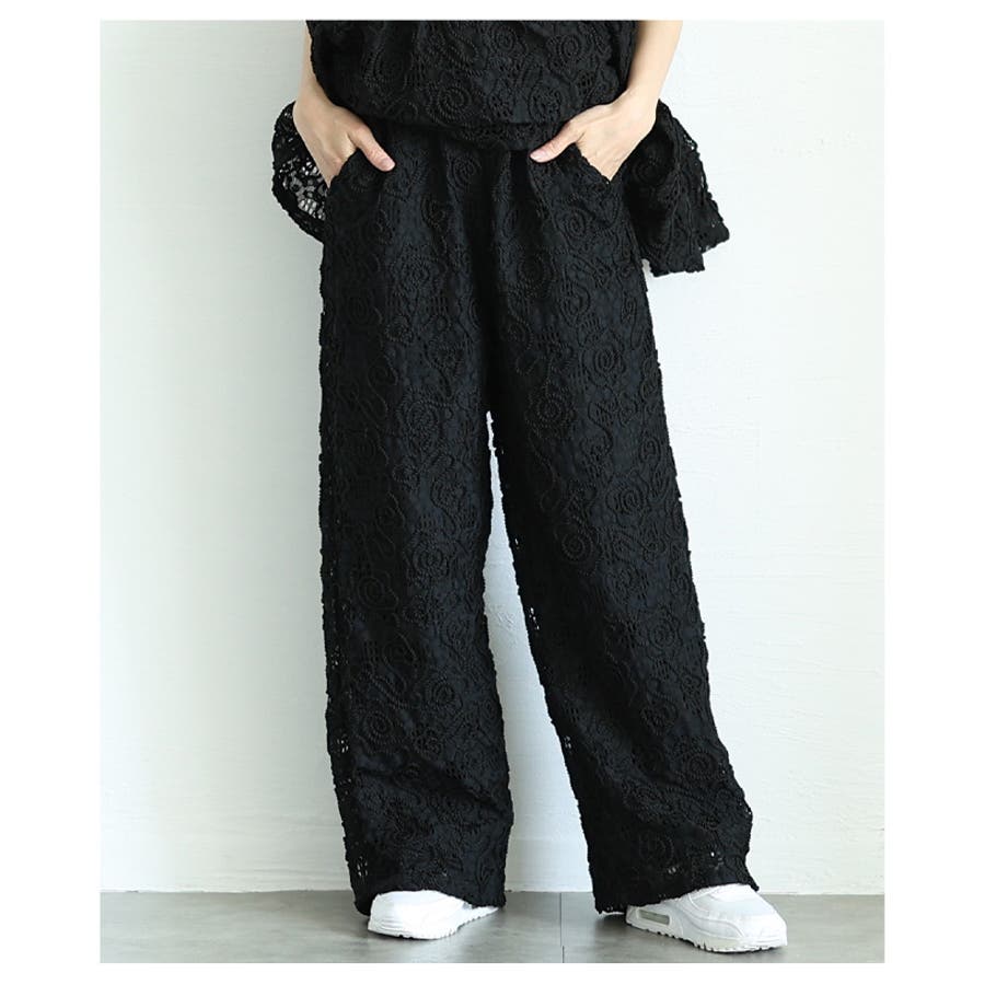トレンド重ねる花柄コード刺繍メッシュワイドパンツ レディース ファッション