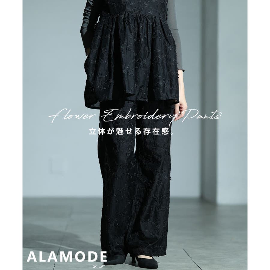 共布トップスとセットアップとしても使えるワイドパンツです。立体花刺繍生地が女心をくすぐる一着。脚のラインを拾わないセミワイドシルエットで穿きやすさも抜群です。