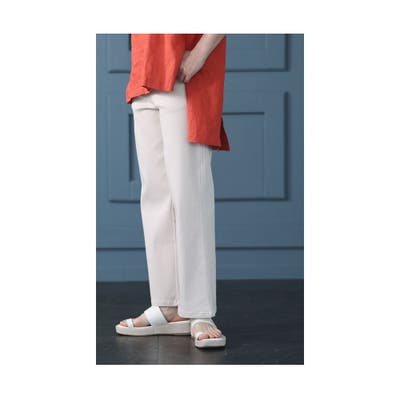 パンツ丈は床につくくらいでした。写真では8センチヒールを合わせています。程よい厚みがあり、脚のラインを拾わず穿けるセミワイドのストレートシルエットです。伸縮性があるのでしゃがんでも楽でした。股上はしっかり深めで安定感がありました。ウエストは総ゴム入り、ファスナーのないプルオンタイプで楽に着脱できました。前後に2つずつポケット付きです。