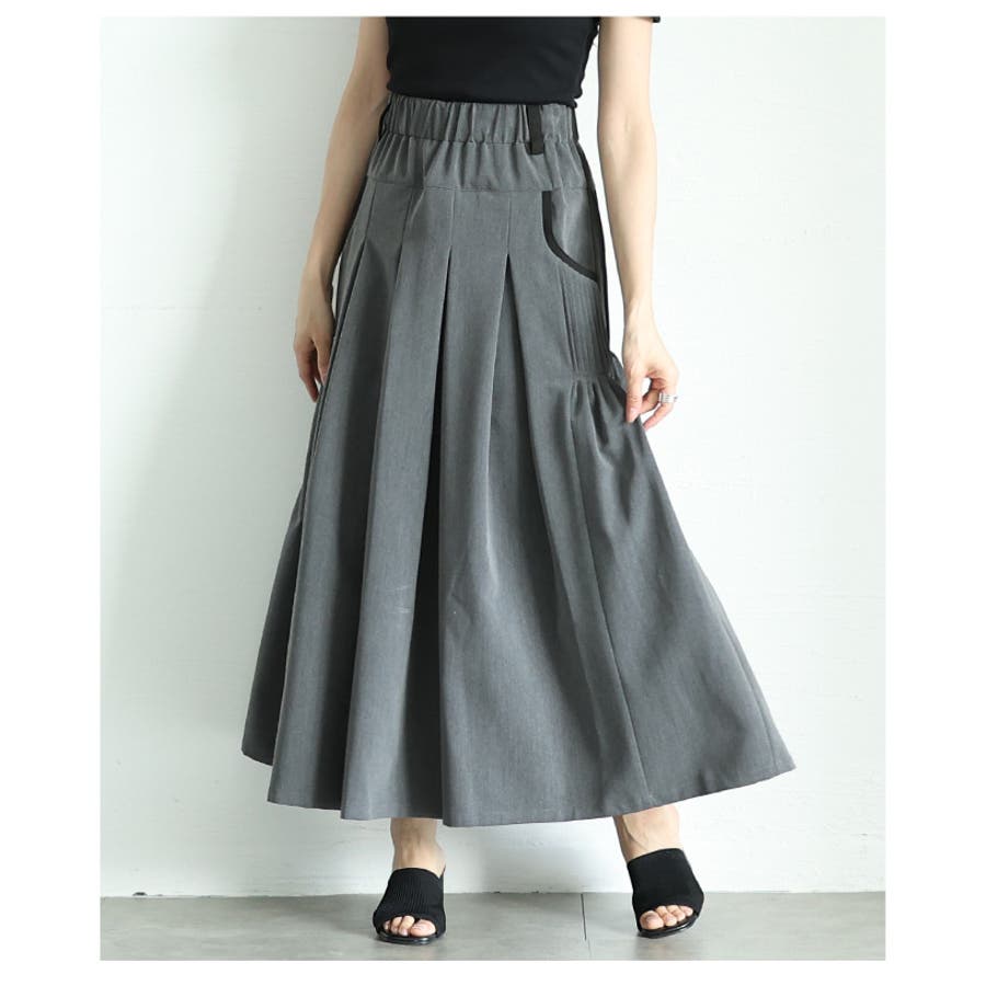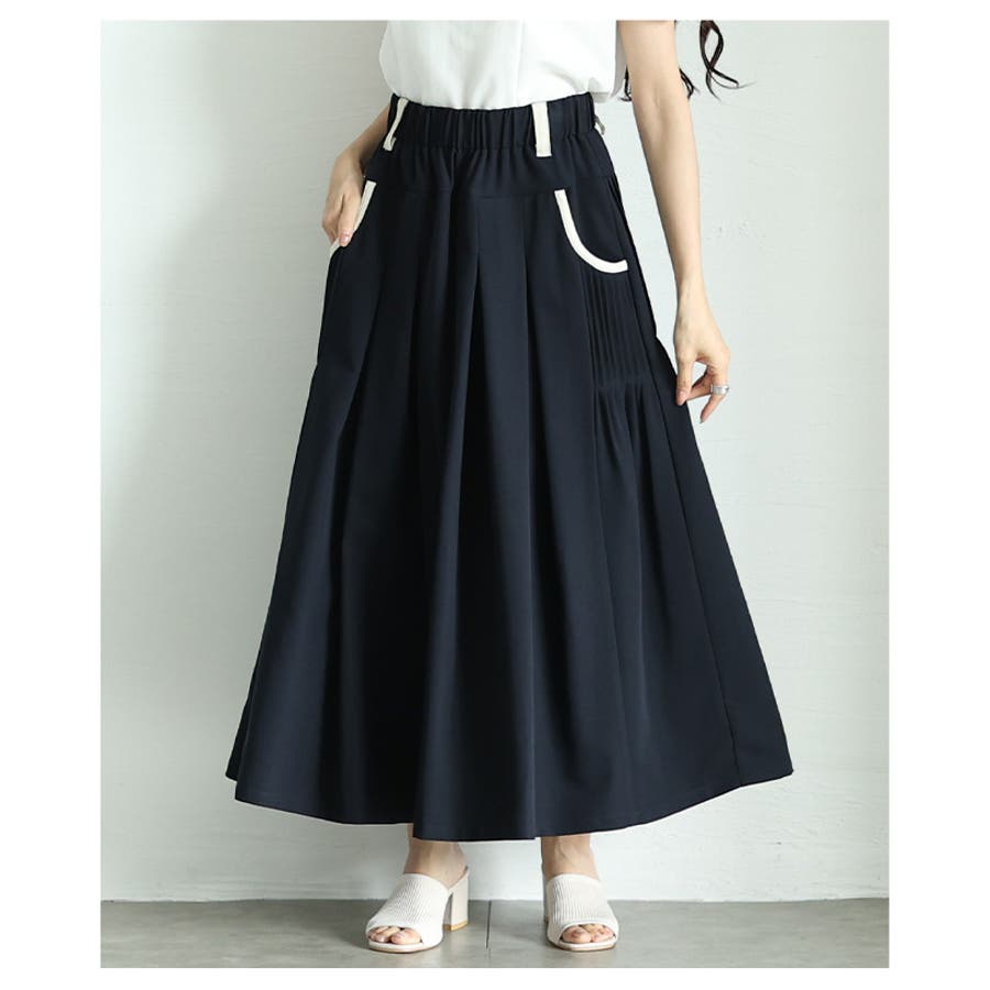 特徴: プリーツ タック プリーツ ウエストゴム 配色 パイピング ベルトループ フレア ポケット