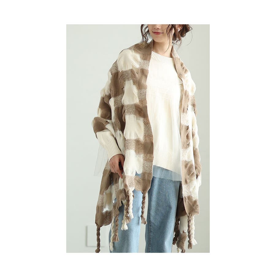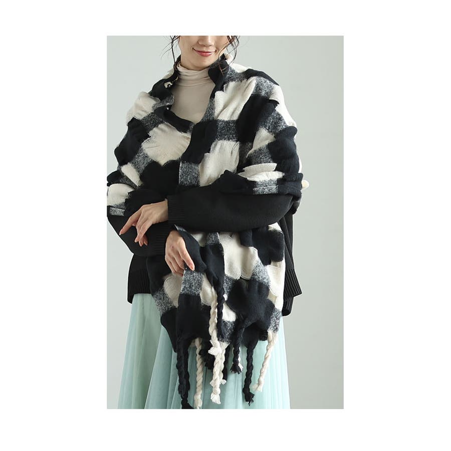 編みかえによってカッティングのようにも見える、デザイン性の高いストールです。2色のブロックチェックのような柄も目を引きます。ふわりとやわらかい肌触りでとても気持ちいいです。両端はロープ編みでできたフリンジのようになっていて可愛らしいアクセントになっています。
