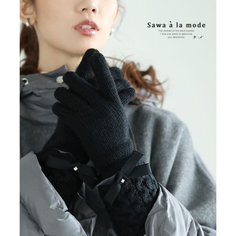 ビジューリボンが煌く手元華やぐニット手袋 レディース ファッション