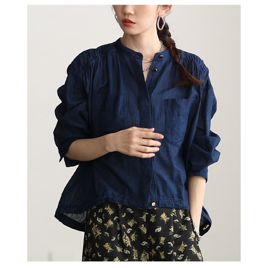 軽やかな風を纏うシアーデニムギャザー裾ドロストシャツ レディース ファッション