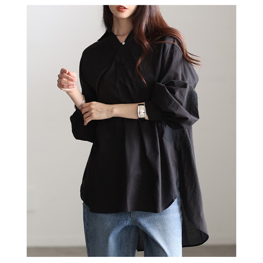 さり気ない甘さ漂う花柄刺繍スキッパーチュニックシャツ レディース ファッション