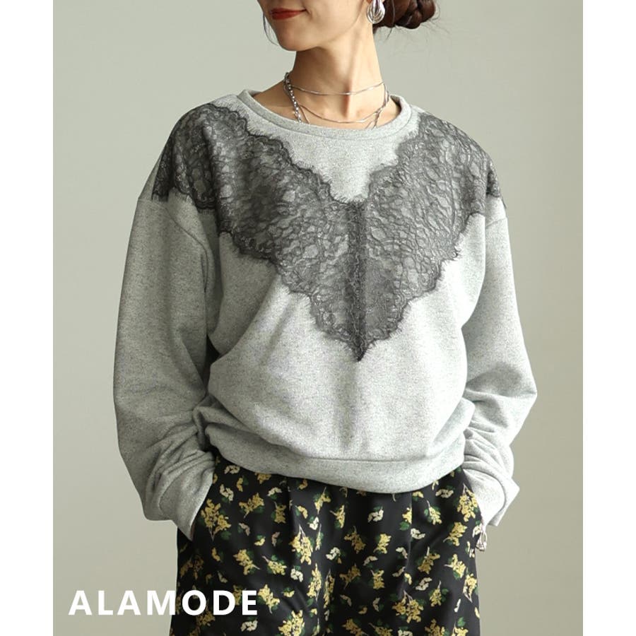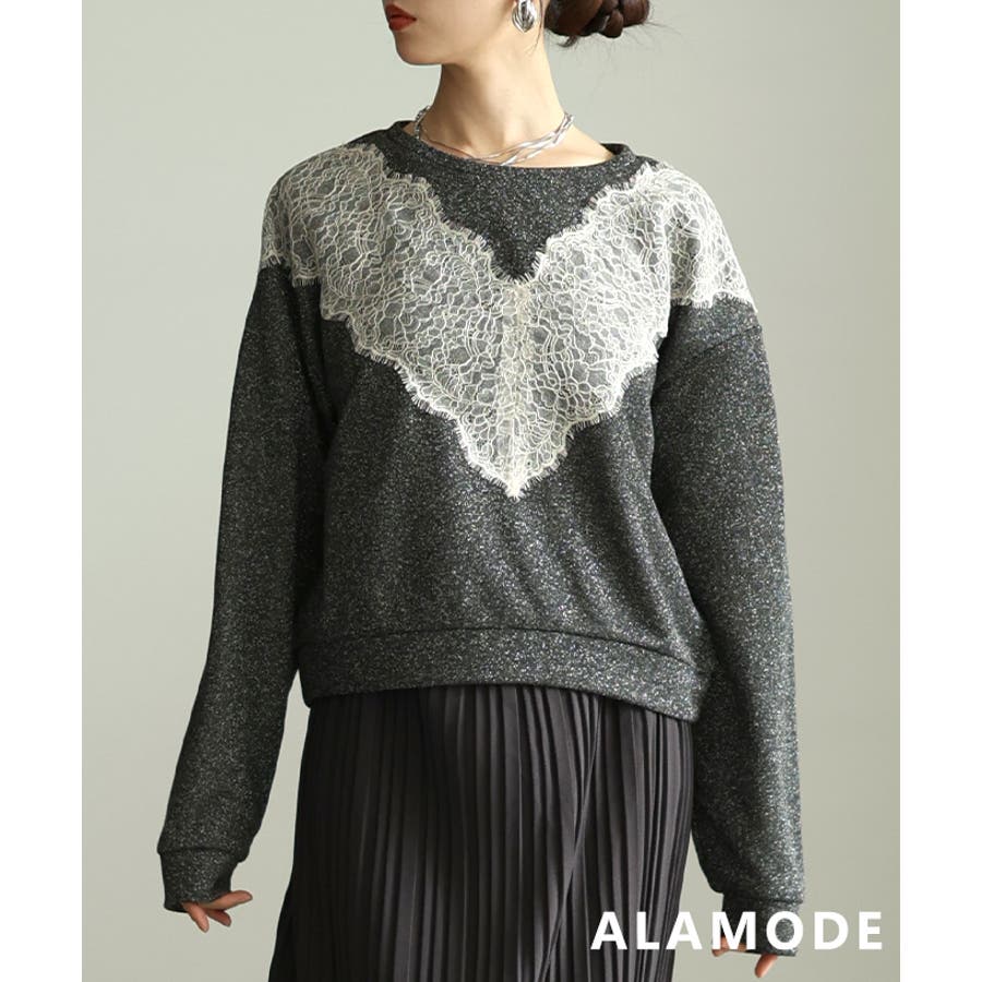 レースが織り込まれたスウェットにレースが施されたプルオーバーはアクセサリーいらずの華やかさ!