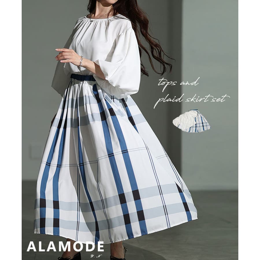 バルーンスリーブトップス&チェック柄ロングススカートセットアップ レディース フ…