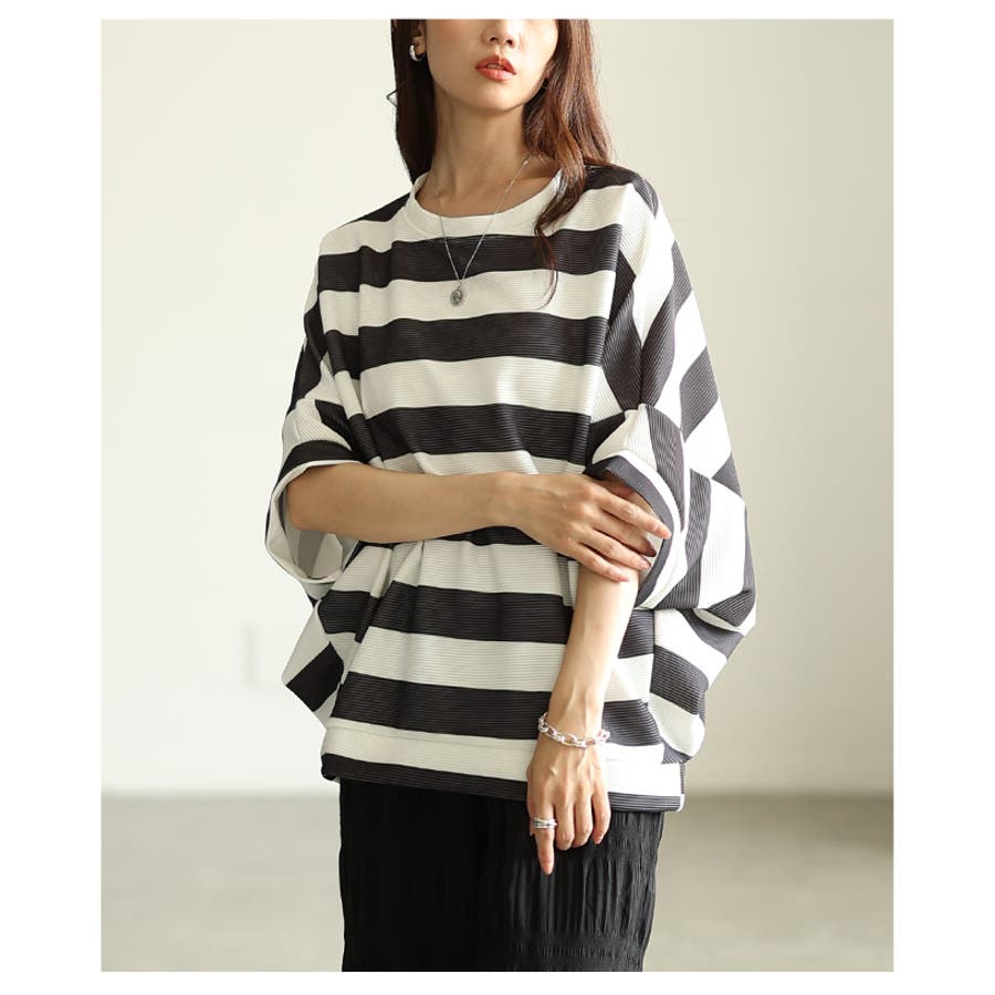細リブ生地とふとボーダーのコントラストが技ありポイント五角形シルエットで体型カバー効果も抜群です。