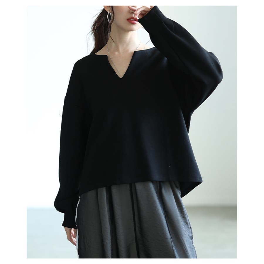 深めのVネックで顔周りをすっきり見せ、コクーンシルエットの袖が特徴のプルオーバーです。そのまま一枚でサラっと着るのは勿論、深めのVネックだからこそ活きるインナーとのレイヤードスタイルもおすすめです。
