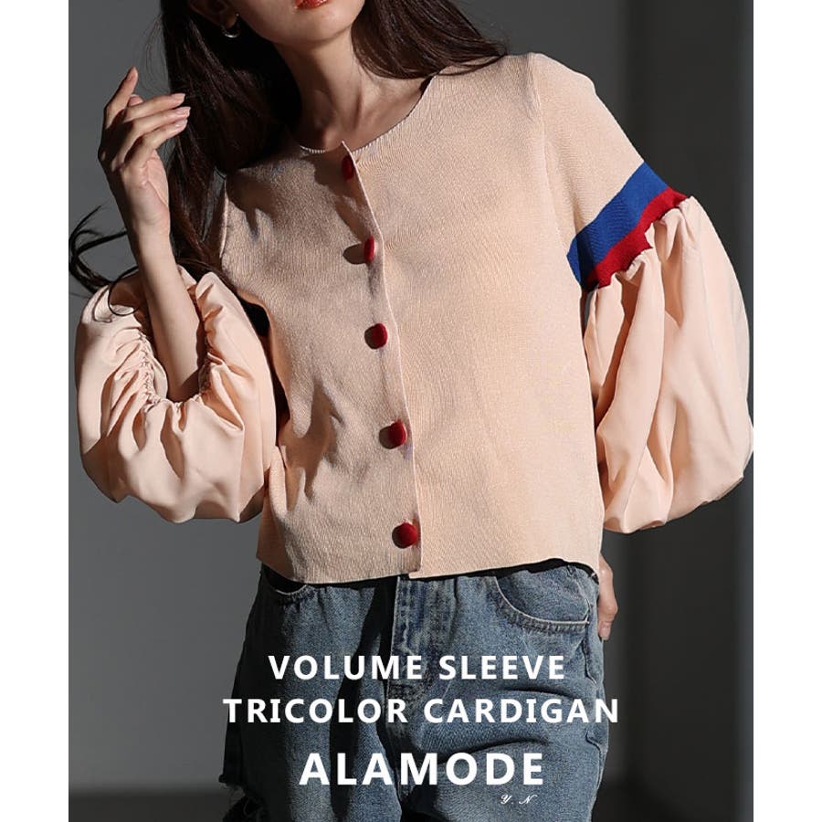 ポップで可愛いボリュームスリーブトリコロールカーディガン レディース ファッショ…