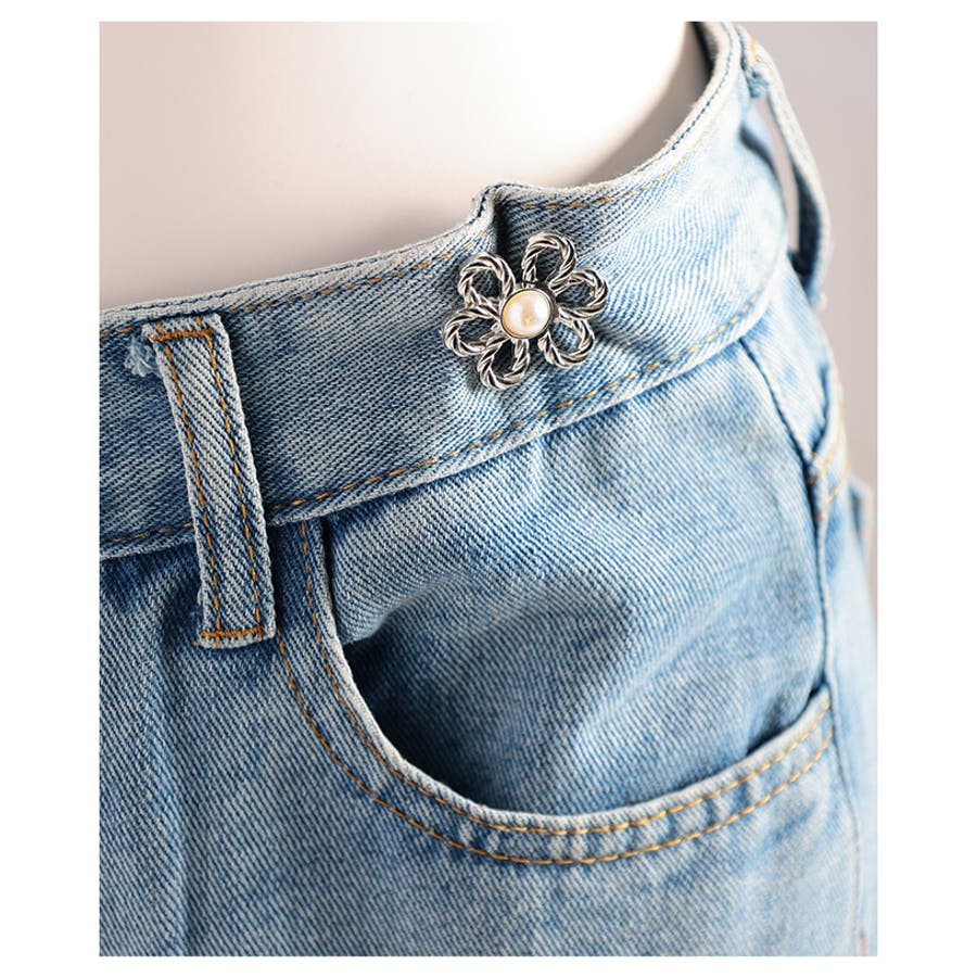 ウエストが調整できるピンタイプのボタンです。ワンタッチでサイズ調整ができるアジャスターで見た目もかわいくアクセントになります。取り付ける幅も自分好みで変えられるのがいいですね。