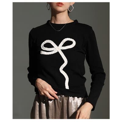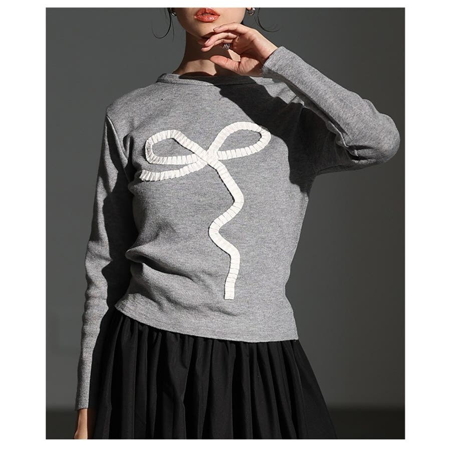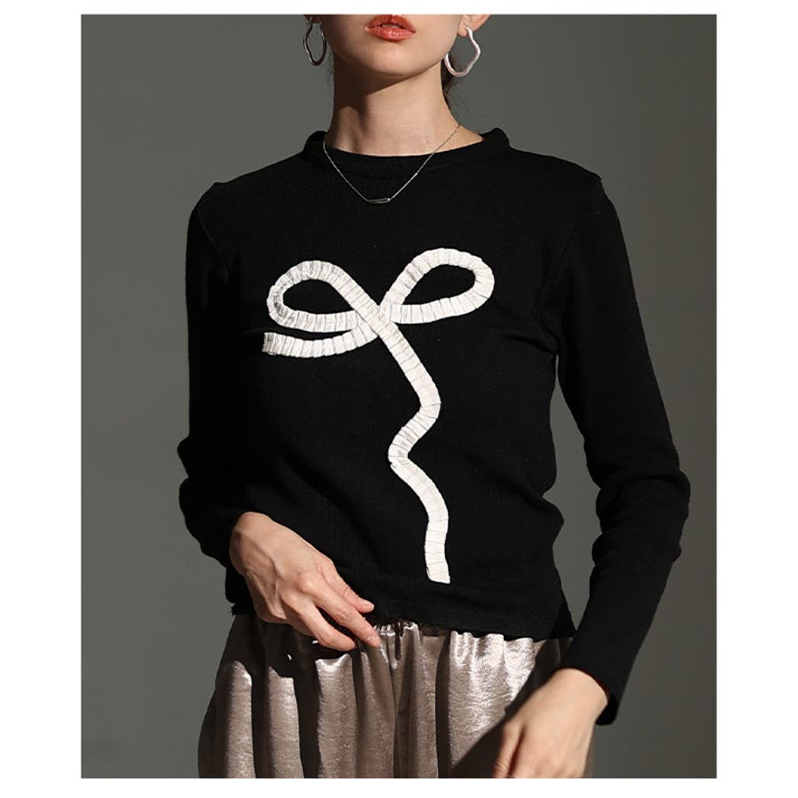 心惹かれるプリーツリボンが描かれたニットトップス レディース ファッション