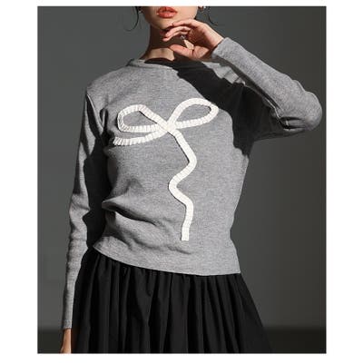 フロントの大きなリボンモチーフがポイントのニットトップスです。このリボン、ちゃんとリボンで出来ていて遊び心も抜群!コンパクトなシルエットなのでフレアスカートやワイドパンツなどボリュームのあるボトムスとの組み合わせがおすすめです☆