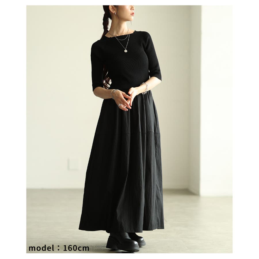 コンパクトなリブニットと布帛のスカートがドッキングされたワンピースです。